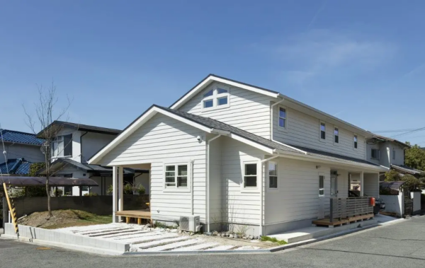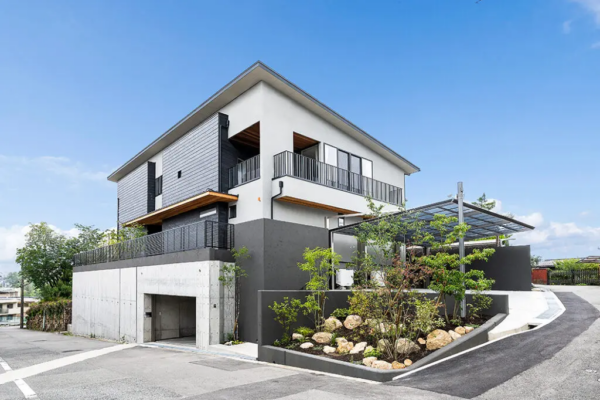 神戸市北区に建てられた分離型の二世帯住宅。玄関をひとつにまとめることで、二世帯でありながらすっきりとした外観になりました。子育て世帯のフロアは生活動線を重視した設計に、親世帯のフロアにはサウナやジムルームを設けるなど、それぞれの暮らし方に合わせた空間に仕上げています。両世帯の間には中庭が設けられ、程よい距離感を保ちながら家族のつながりを感じられる設計になっています。